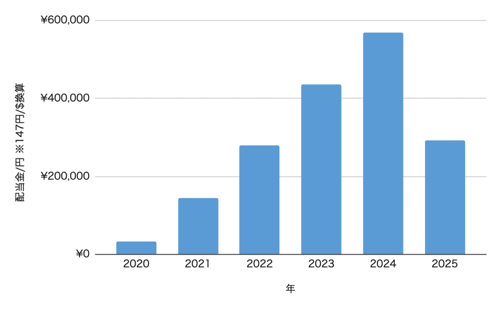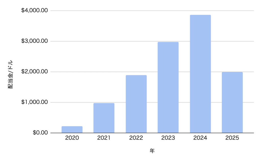 2025年が金額が小さくなっているのは、1~8月分の配当金を記載しているためです。